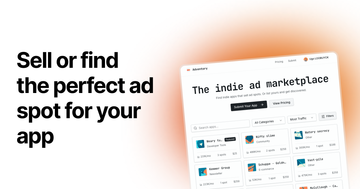 Adventory serves as a dedicated marketplace specifically designed for indie sponsorship and ad spot transactions. It connects app owners who have advertising space available with advertisers looking to promote their products through targeted placements.