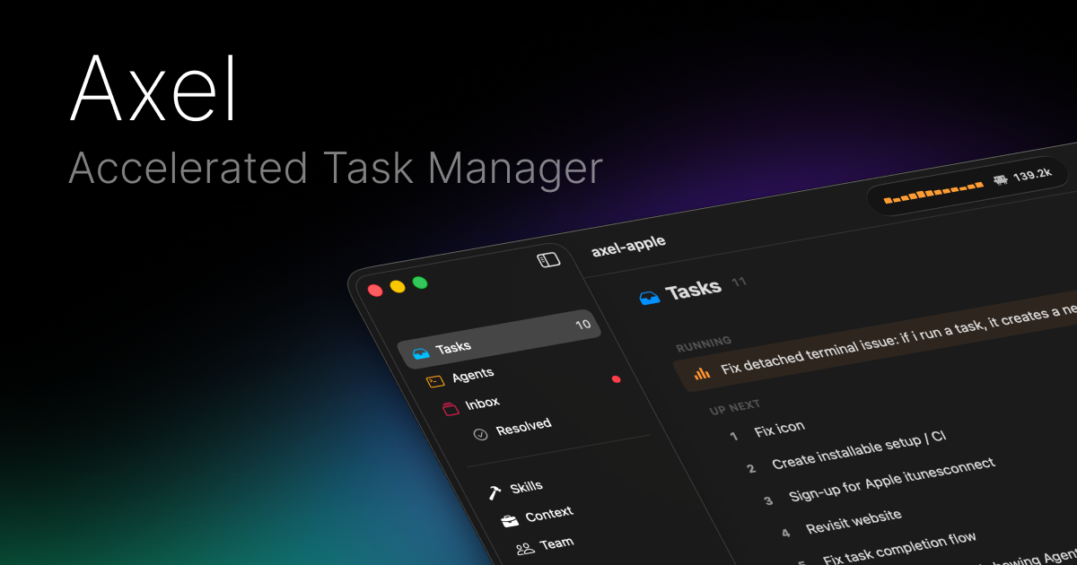 Axel is a native macOS application designed as an accelerated task manager specifically for managing AI coding agents. It allows users to queue tasks, dispatch them to appropriate AI agents, and manage permissions from a centralized interface. The platform works with Claude, Codex, OpenCode, and Antigravity AI agents out of the box.