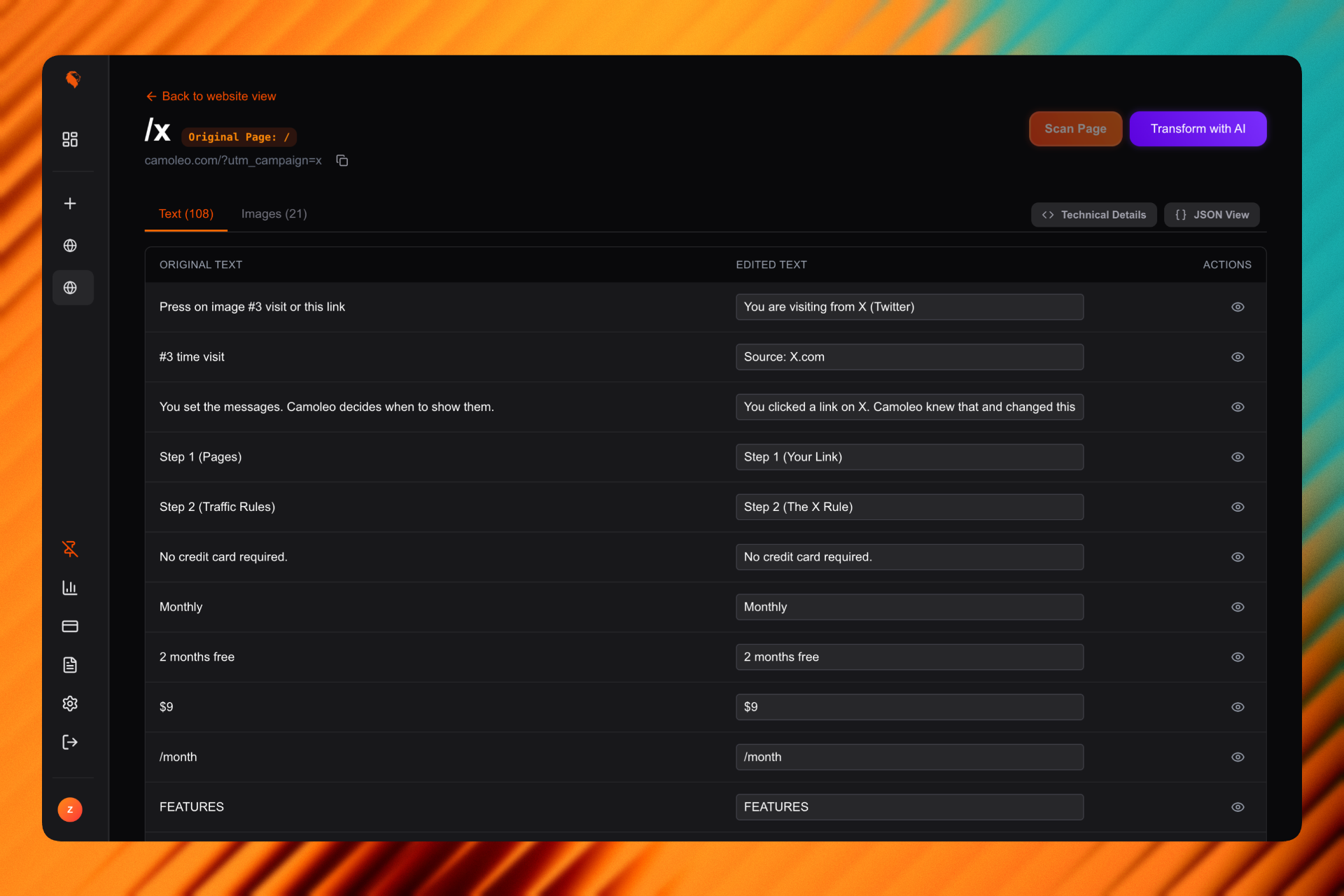 Camoleo is designed for small teams that share links in many places without rebuilding pages, particularly those using platforms like Reddit, X, or email marketing. It serves businesses that want to show different messages to visitors from different sources while maintaining the same URL structure. The platform targets marketers and website owners who need to personalize content based on traffic sources, returning visitor status, or specific campaign parameters.