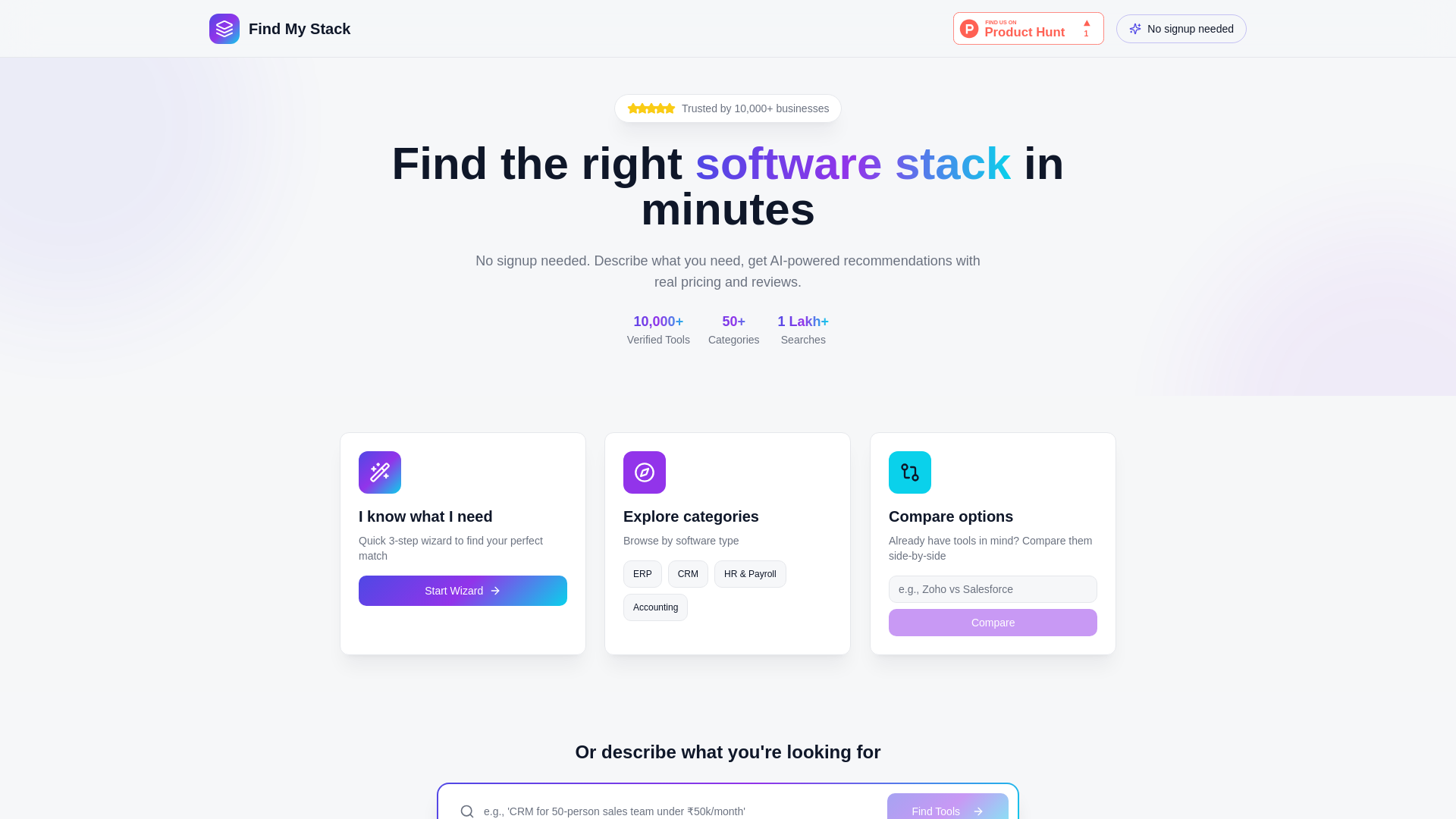 The platform targets small and medium businesses needing software discovery assistance, with particular focus on ERP, CRM, HRMS, and accounting tool selection. It has been trusted by 10,000+ searches and offers both free and paid access levels.