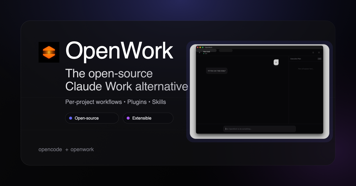 OpenWork is an open-source desktop application designed for agentic work, built with extensibility as a core principle from the beginning. It serves as an open-source alternative to Claude Work, powered by OpenCode, enabling users to run local-first sessions, manage plugins, and install skills.