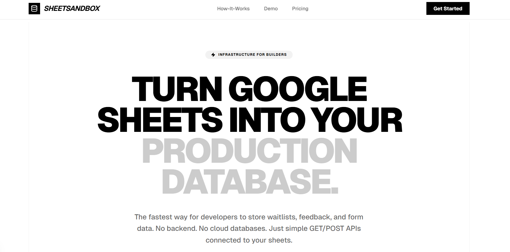 SheetSandbox targets developers who need to quickly set up data collection systems without backend infrastructure. It integrates directly with Google Sheets and provides API endpoints for data management.